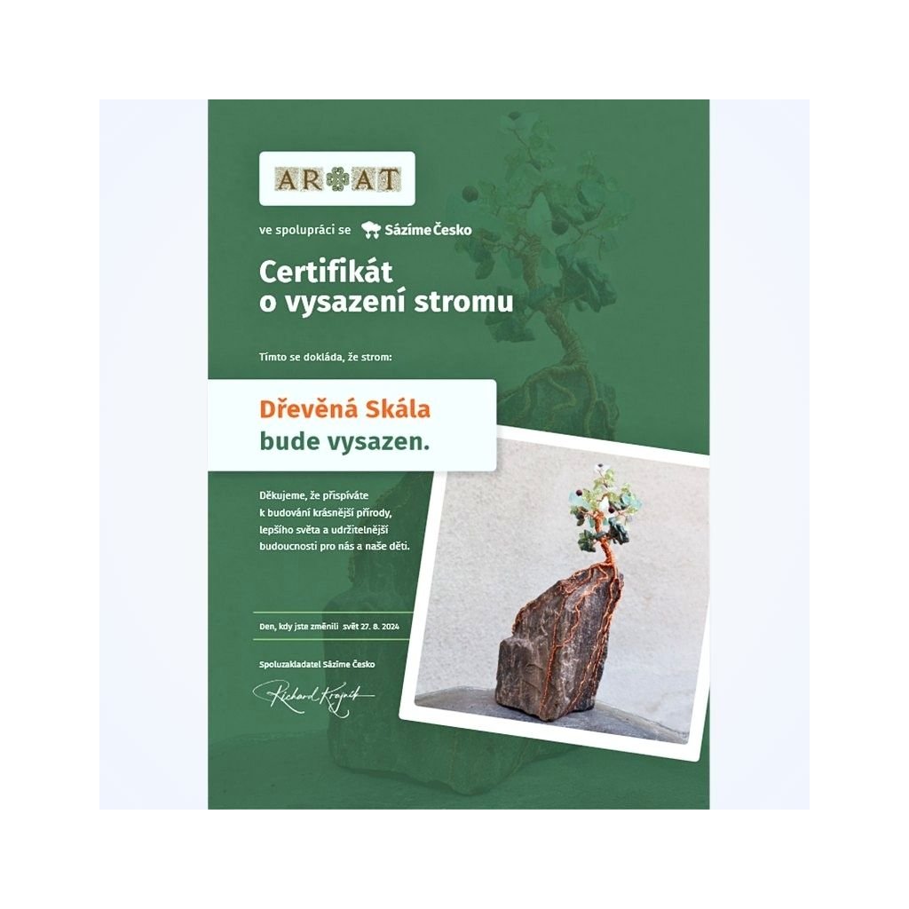 S radostí, a v souladu s nařízením GSPR (General Safety Product Regulation), tady uvádíme veškeré informace o původu talismanu Dřevěná Skála. Je to ručně drátovaný Strom Života s minerály, určený pro dekorativní účely v interiéru. Ačkoliv to zní zvláštně, musíme uvést, že není určen ke konzumaci, jako hračka pro děti ani jako náhrada odborné zdravotní péče.