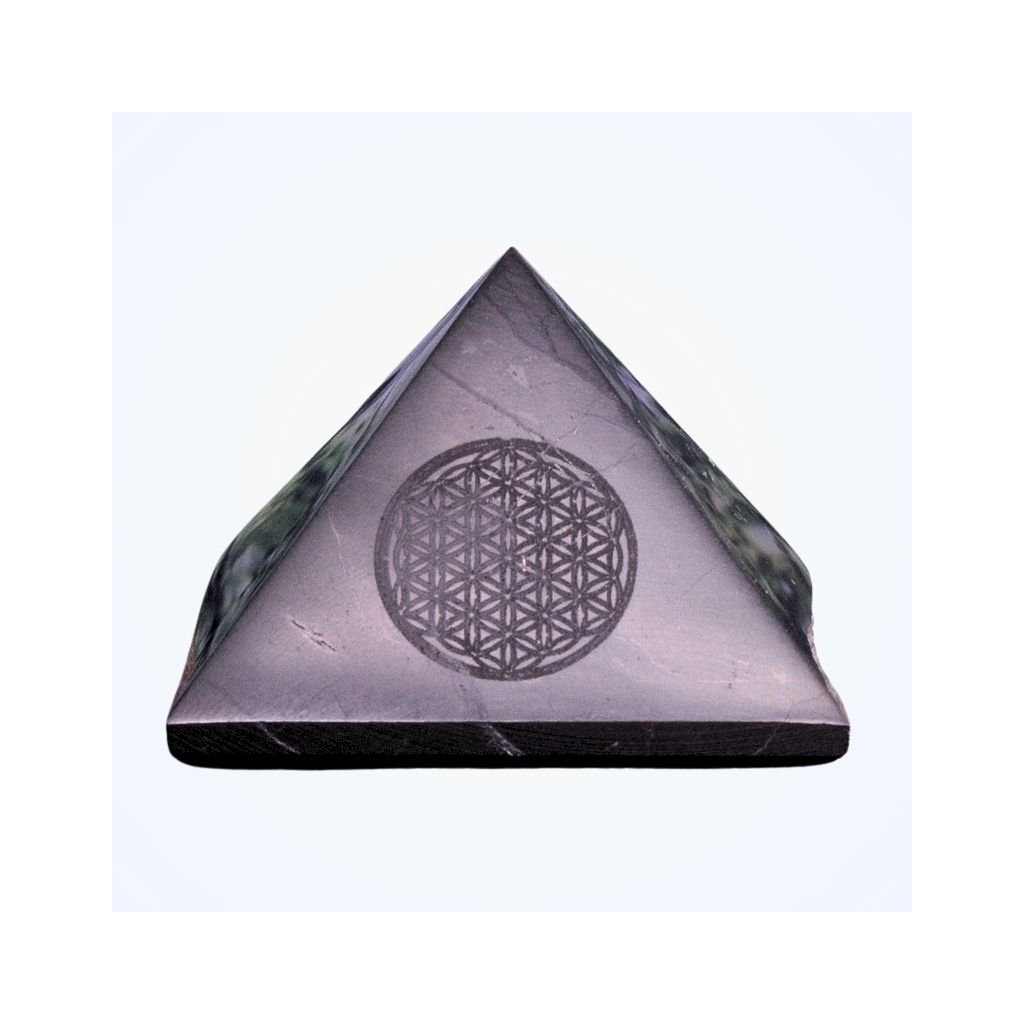 Šungitová pyramida je víc než dekorace pro Tvůj stůl či oltář – je to ochranný talisman se silou elementu Země. Harmonizuje 1. kořenovou čakru a podporuje stabilitu, vnitřní klid a odolnost. Ve svém okolí tlumí elektromagnetické záření (tzv. elektrosmog) i působení geopatogenních zón, jako jsou podzemní prameny či anomálie geologického podloží – a to až do vzdálenosti 150 cm. Pro nejsilnější účinek ji nasměruj v ose Sever → Jih (čelo pyramidy míří na jih). Gravírovaný symbol Květ Života – posvátný obraz jednoty, harmonie a tvořivé síly – zesiluje její působení. S radostí Tě podpoří a ochrání kdekoliv, kde si budeš přát.