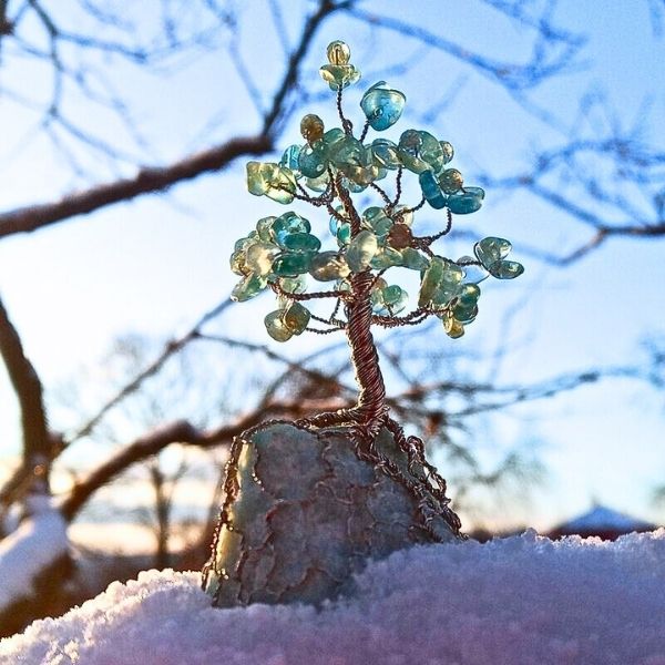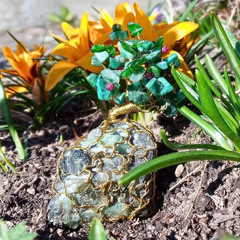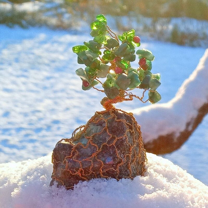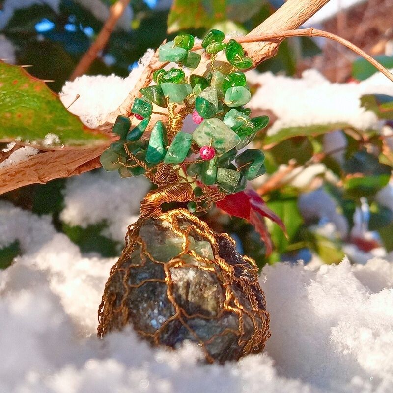 Během podzimu 2024 se Smaragdová Jabloň rozhodla, že chce vykročit za svým štěstím – do ateliéru drátovaného šperku Monsterance. Zde spokojeně zářila na návštěvníky i dráteníce, než se jí znovu zastesklo po kurzech tantrické masáže. Po mnoha krásných společných zážitcích při cestování jsme spolu dorazily až do Centra Transformace uprostřed Černívska. Tam se během června 2025 seznámila se svou majitelkou – a s radostí zakořenila v novém domově. Přejeme jim mnoho radosti a štěstí v životě! 🍀