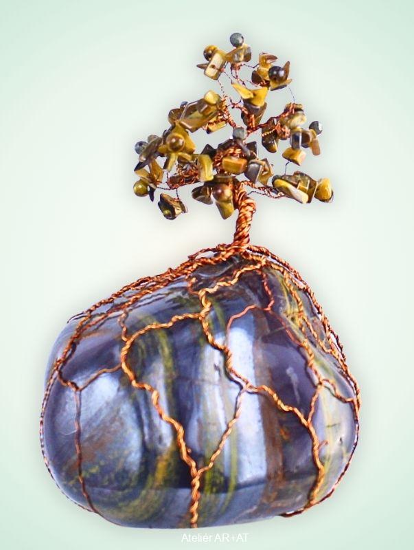 Heart of Tiger is formed by delicate copper branches growing around a massive pebble of tiger iron. It rested in the Magical Forest for many decades before it longed for its own Tree of Life. Its crown bears fruits and leaves of tiger eye, as well as blossoms made of pyrite with petals of tiger eye.