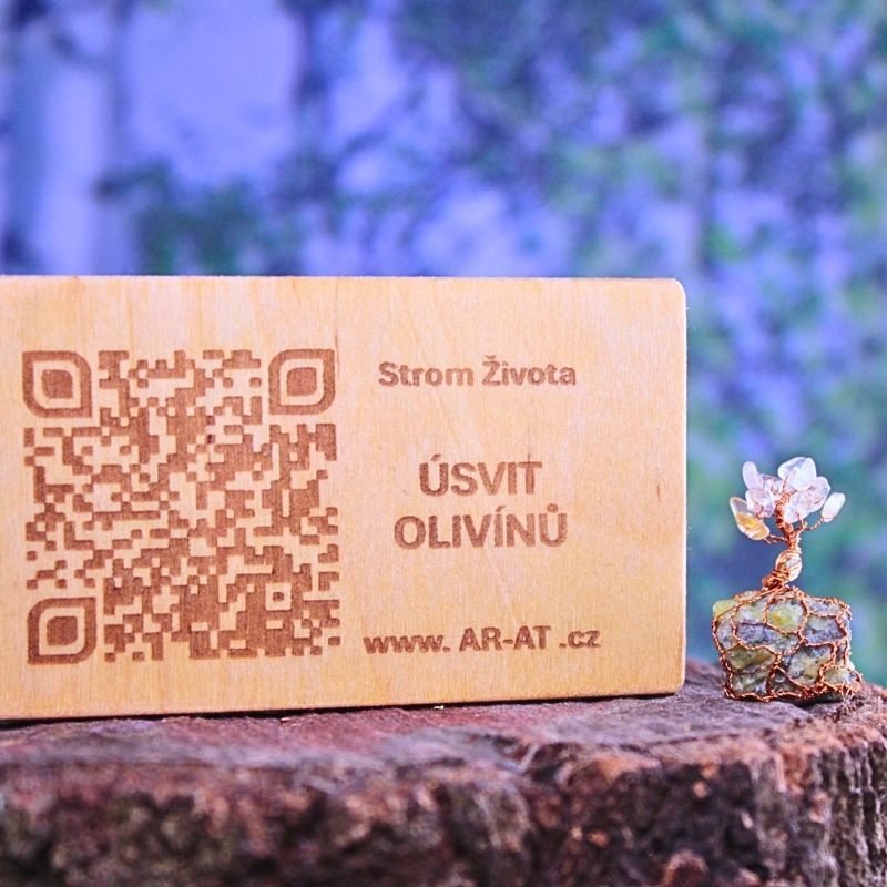 Ohnivý Olivín je miniaturní Stromeček Štěstí, rostoucí na českém peridotitu z lomu Smrčí. Lakované měděné větvičky nesou lístky slunečního kamene a plody aventurínu, na boku má drátované srdíčko. Podporuje vášeň a radost, lásku i sebelásku. S již zasazeným Stromovým dvojčetem v českých lesích.
