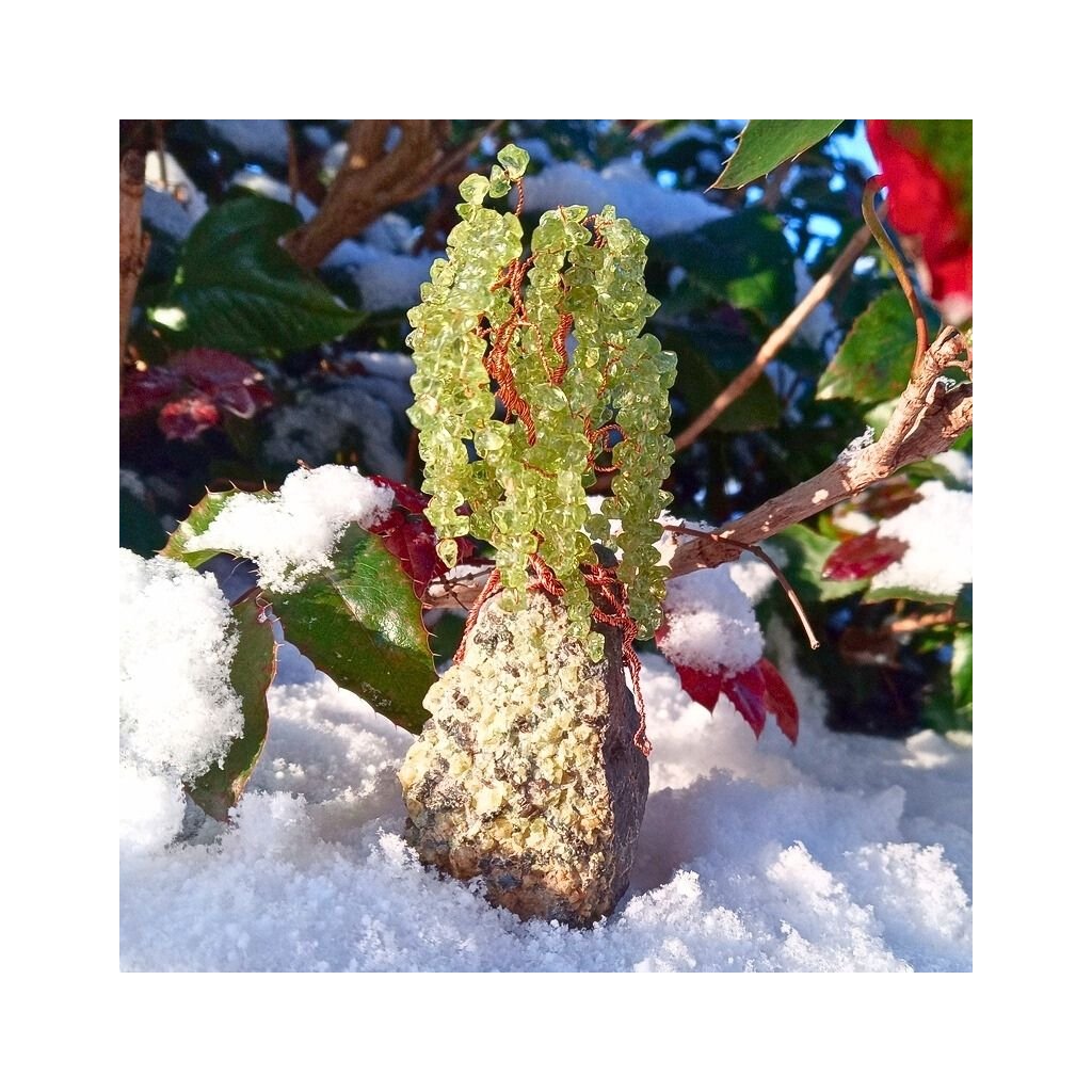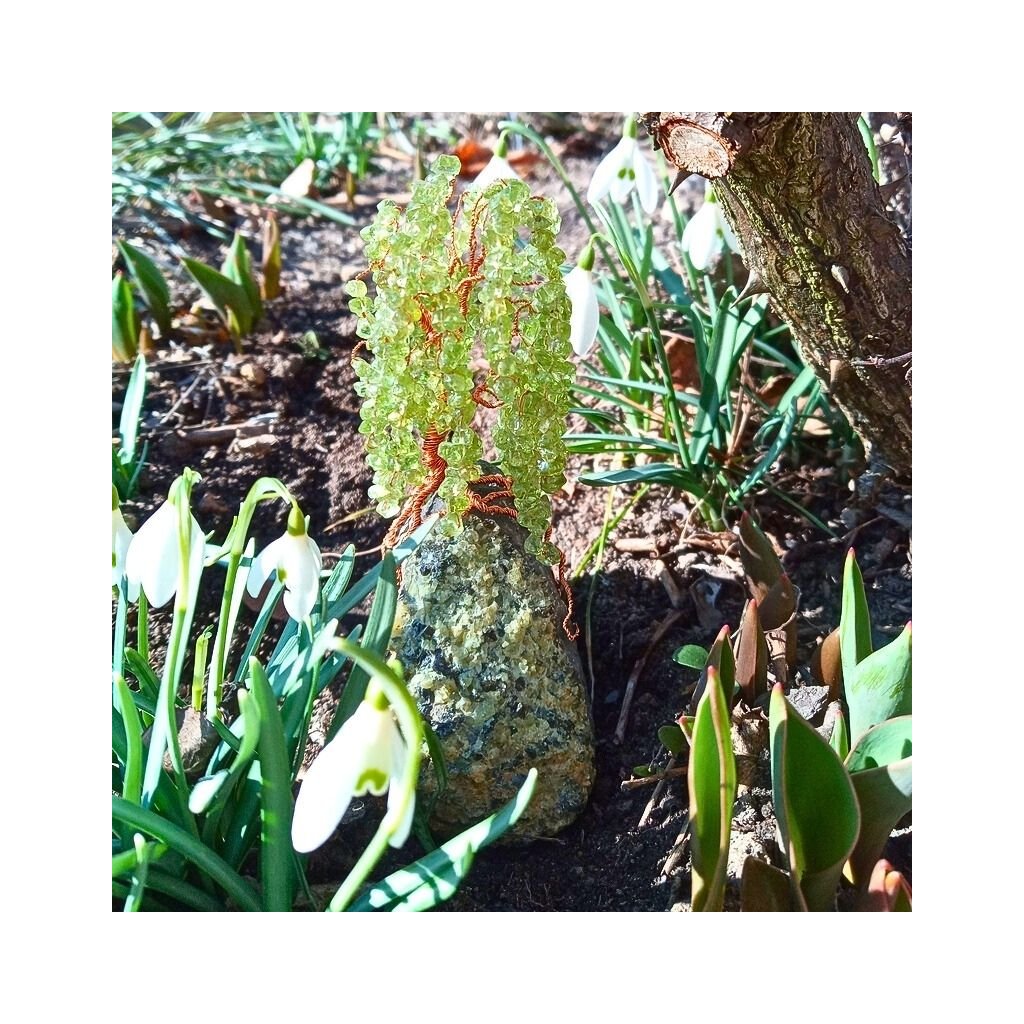 Zelená Vrba roste na surovém útesu českého olivínovce (peridotitu), který tvoří drobná zrnka olivínu. Na svých dlouhých lakovaných měděných větvích nese lístky z olivínu.