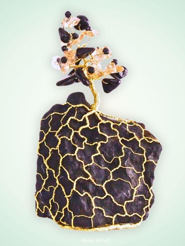 Golden Shungite bears blossoms of faceted shungite in its copper crown, with petals of citrine and leaves of shungite. Its roots firmly embrace a cliff of raw shungite, and on the standing base they form a wired spiral.